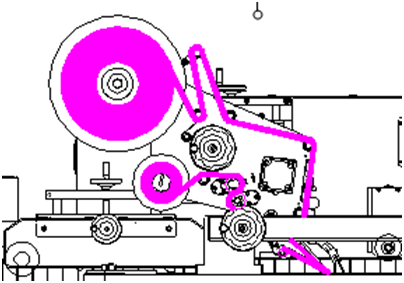 2. 按圖示出標(biāo)方向,把標(biāo)簽料卷裝入,再把三角形料盤套上并裝好扭緊;